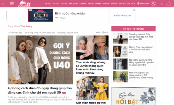 Địa chỉ website : https://eva.vn/thoi-trang-c36.htmlChuyên mục thời trang của Eva. vn tư vấn cách phối đồ, mặc đẹp cũng như update khuynh hướng thời trang của sao, tin tức từ những hãng nổi tiếng .Nội dung của trang phong phú, theo sát xu thế và thị trường. Tuy nhiên có quá nhiều quảng cáo gây không dễ chịu và nội dung không sâu xa, xuyên suốt một chủ đề .